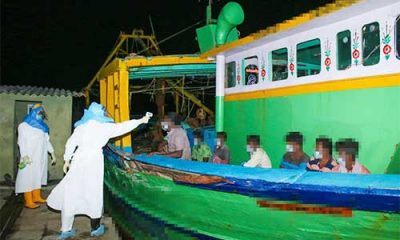 A sailor in protective gear checks the temperature of an arrested Indian fisher(Pic courtesy Navy) 36 Indian fishers, five trawlers held …operations suspended in March...