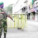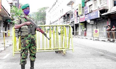 A soldier guards an entry point to the Kandy Esala Perahera route to prevent people entering it when the Perahera began last Saturday. (Pic by Cyril...
