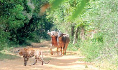 These wild buffaloes which stumbled on a strolling leopard in the Wilpattu National Park charged at the predator instead of fleeing. Moments later the leopard disappeared...