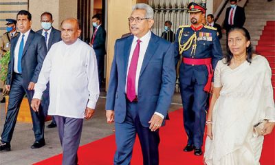 President Gotabaya Rajapaksa leaving parliament after delivering his policy speech. The President is accompanied by Speaker Mahinda Yapa Abeywardena and the First lady Ioma Rajapaksa. ...